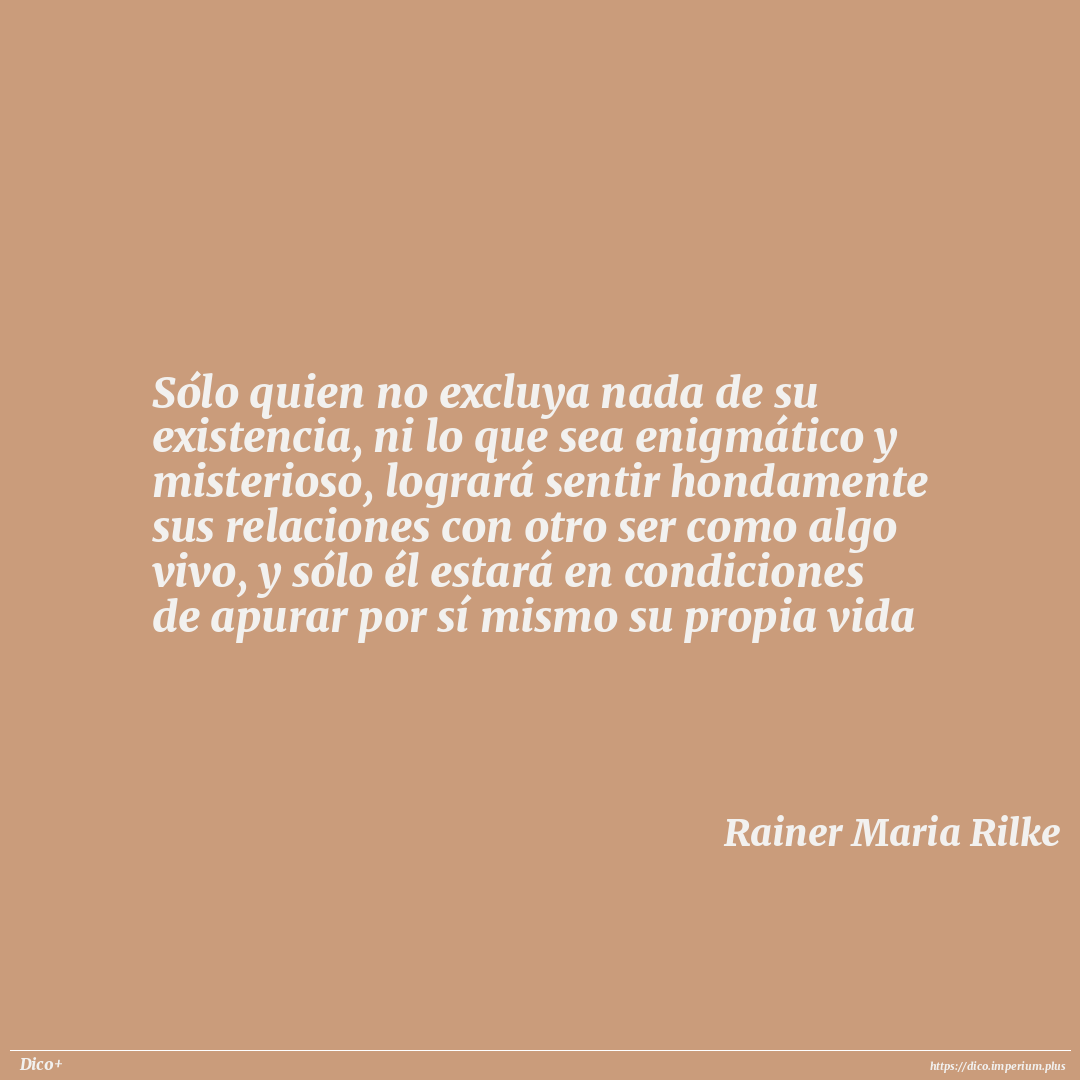 Sólo quien no excluya nada de su existencia, ni lo que sea enigmático y misterioso, logrará sentir hondamente sus relaciones con otro ser como algo vivo, y sólo él estará en condiciones de apurar por sí mismo su propia vida