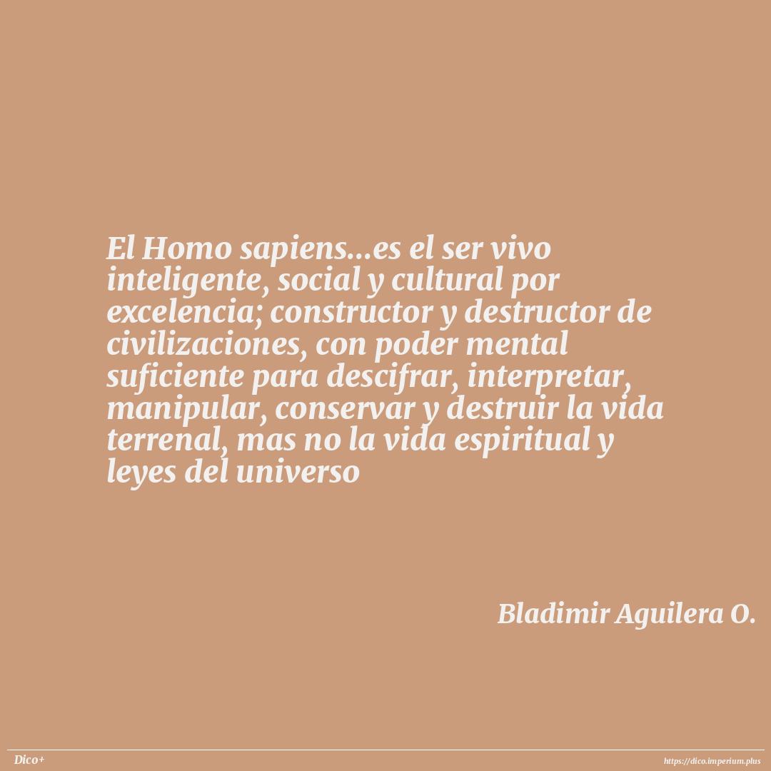 El Homo sapiens...es el ser vivo inteligente, social y cultural por excelencia; constructor y destructor de civilizaciones, con poder mental suficiente para descifrar, interpretar, manipular, conservar y destruir la vida terrenal, mas no la vida espiritual y leyes del universo