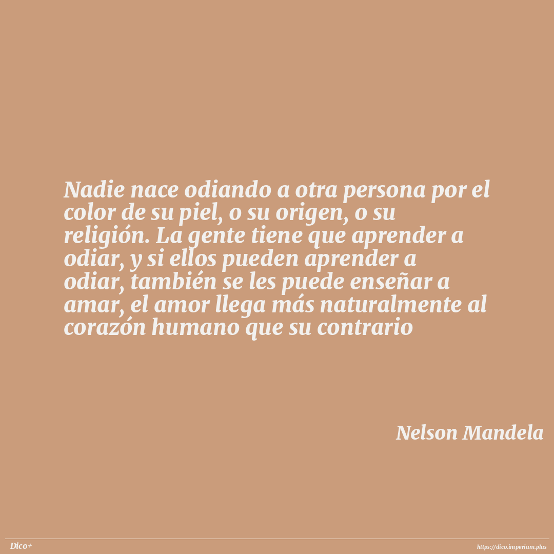 Nadie nace odiando a otra persona por el color de su piel, o su origen, o su religión. La gente tiene que aprender a odiar, y si ellos pueden aprender a odiar, también se les puede enseñar a amar, el amor llega más naturalmente al corazón humano que su contrario