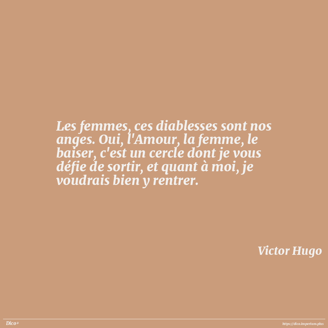 Les femmes, ces diablesses sont nos anges. Oui, l'Amour, la femme, le baiser, c'est un cercle dont je vous défie de sortir, et quant à moi, je voudrais bien y rentrer.