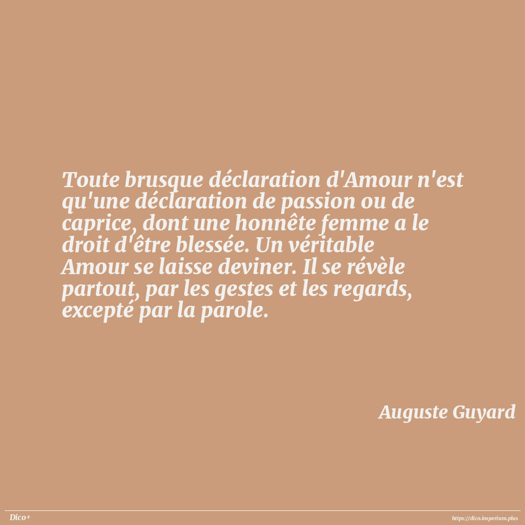 Toute brusque déclaration d'Amour n'est qu'une déclaration de passion ou de caprice, dont une honnête femme a le droit d'être blessée. Un véritable Amour se laisse deviner. Il se révèle partout, par les gestes et les regards, excepté par la parole.