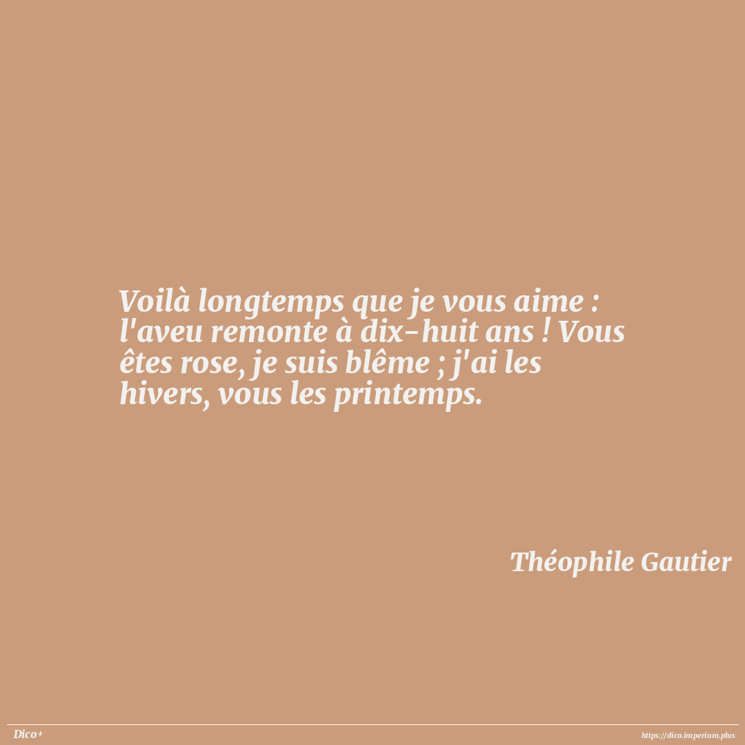 Voilà longtemps que je vous aime : l'aveu remonte à dix-huit ans ! Vous êtes rose, je suis blême ; j'ai les hivers, vous les printemps.