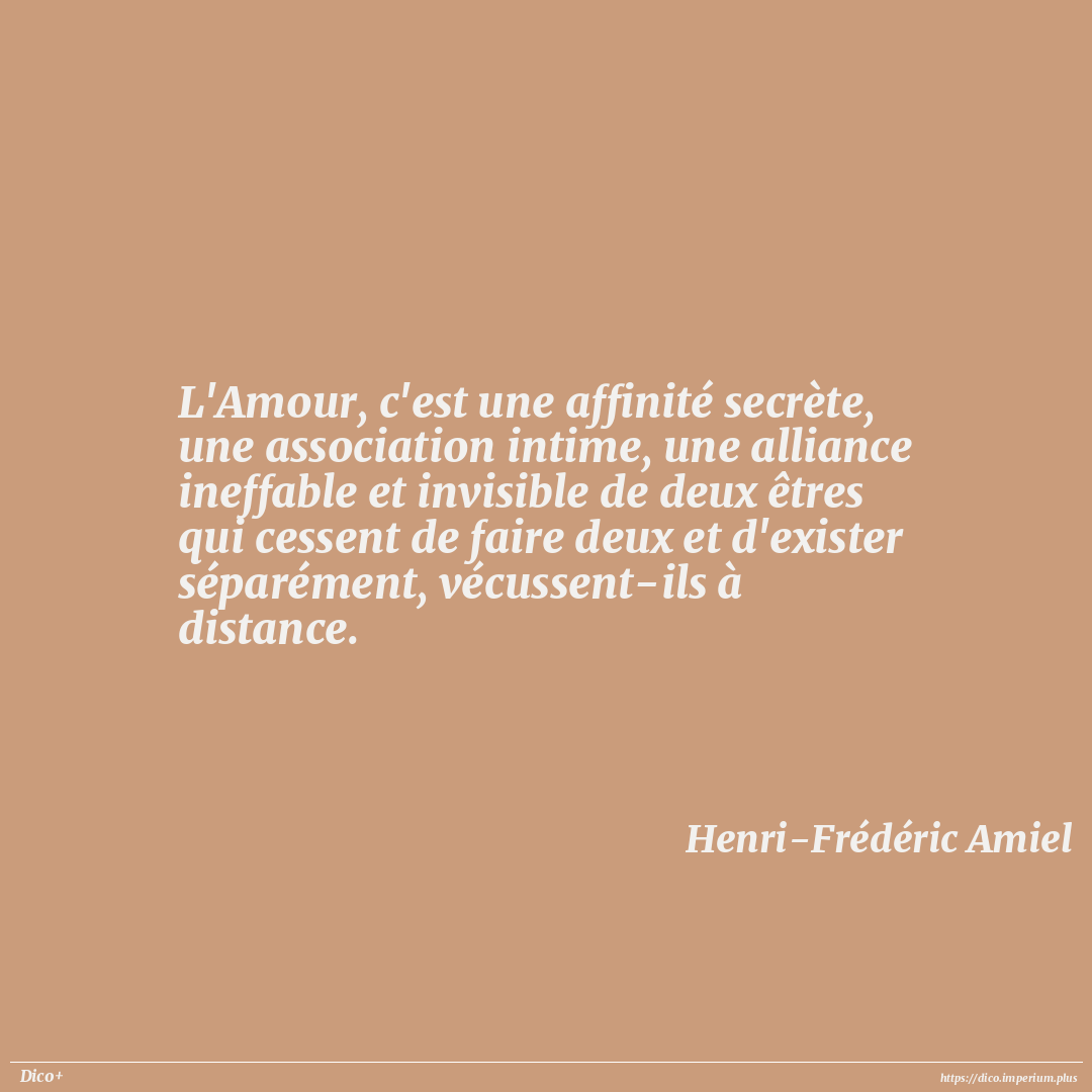 L'Amour, c'est une affinité secrète, une association intime, une alliance ineffable et invisible de deux êtres qui cessent de faire deux et d'exister séparément, vécussent-ils à distance.