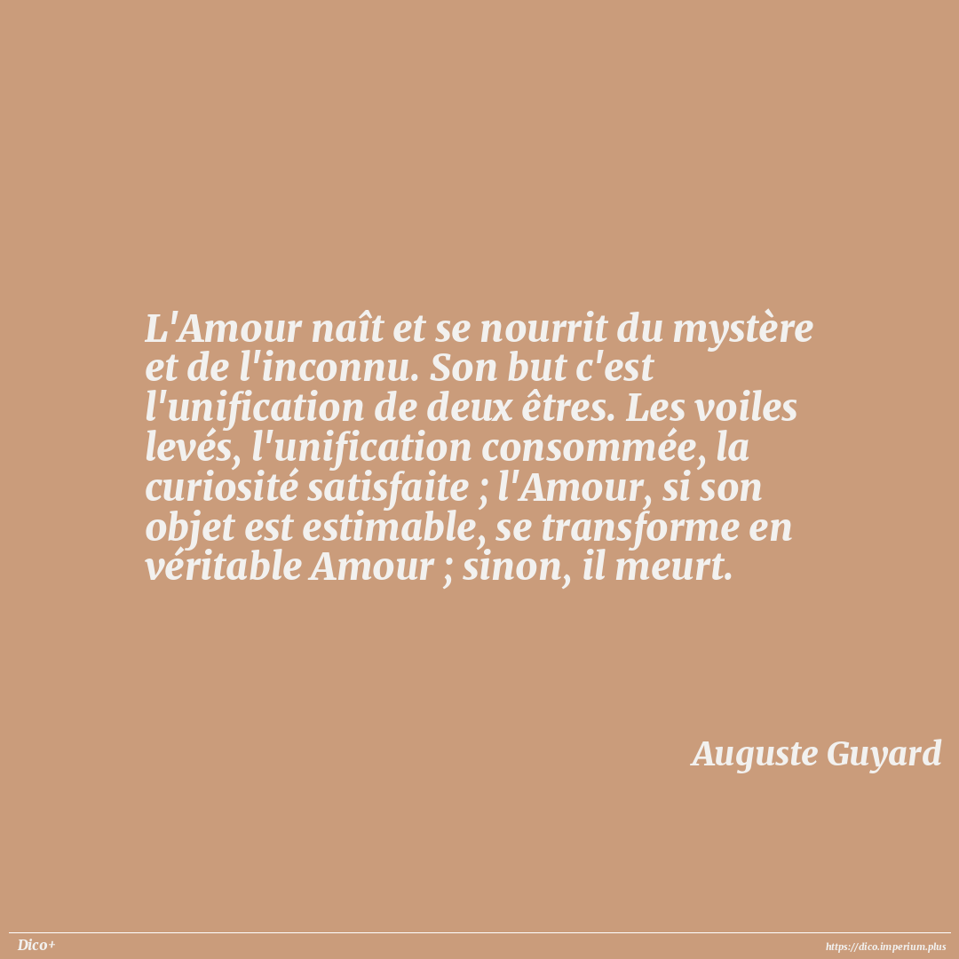 L'Amour naît et se nourrit du mystère et de l'inconnu. Son but c'est l'unification de deux êtres. Les voiles levés, l'unification consommée, la curiosité satisfaite ; l'Amour, si son objet est estimable, se transforme en véritable Amour ; sinon, il meurt.