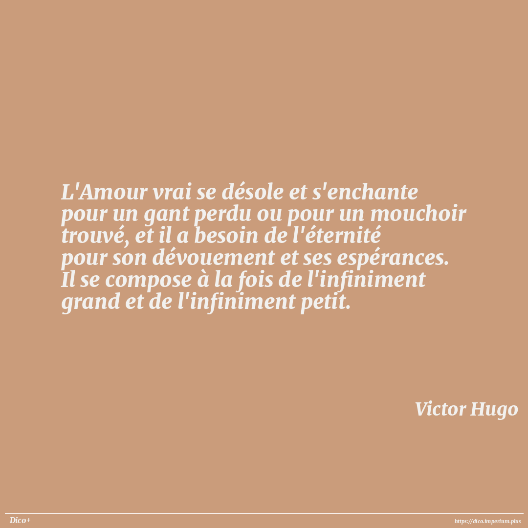 L'Amour vrai se désole et s'enchante pour un gant perdu ou pour un mouchoir trouvé, et il a besoin de l'éternité pour son dévouement et ses espérances. Il se compose à la fois de l'infiniment grand et de l'infiniment petit.