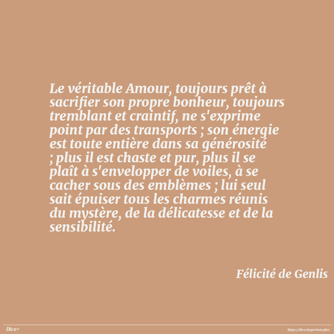 Le véritable Amour, toujours prêt à sacrifier son propre bonheur, toujours tremblant et craintif, ne s'exprime point par des transports ; son énergie est toute entière dans sa générosité ; plus il est chaste et pur, plus il se plaît à s'envelopper de voiles, à se cacher sous des emblèmes ; lui seul sait épuiser tous les charmes réunis du mystère, de la délicatesse et de la sensibilité.