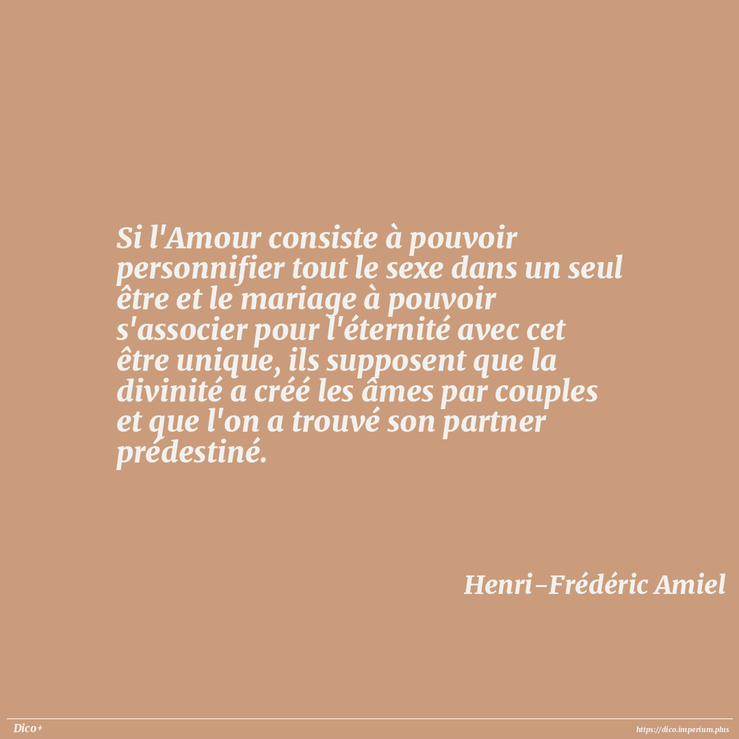 Si l'Amour consiste à pouvoir personnifier tout le sexe dans un seul être et le mariage à pouvoir s'associer pour l'éternité avec cet être unique, ils supposent que la divinité a créé les âmes par couples et que l'on a trouvé son partner prédestiné.