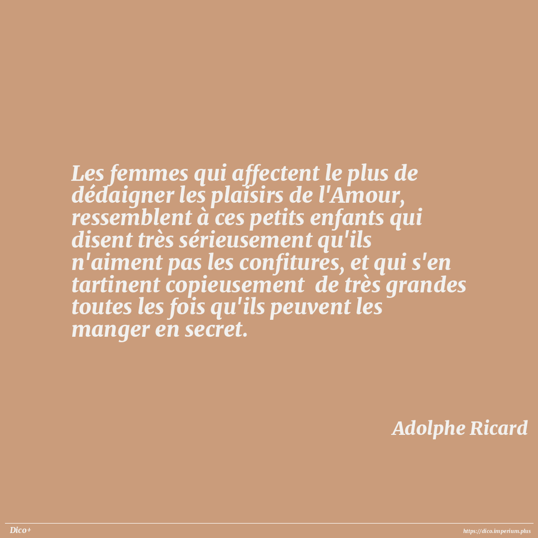 Les femmes qui affectent le plus de dédaigner les plaisirs de l'Amour, ressemblent à ces petits enfants qui disent très sérieusement qu'ils n'aiment pas les confitures, et qui s'en tartinent copieusement de très grandes toutes les fois qu'ils peuvent les manger en secret.