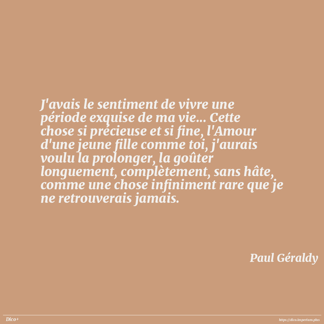 J'avais le sentiment de vivre une période exquise de ma vie... Cette chose si précieuse et si fine, l'Amour d'une jeune fille comme toi, j'aurais voulu la prolonger, la goûter longuement, complètement, sans hâte, comme une chose infiniment rare que je ne retrouverais jamais.