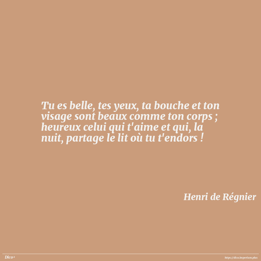 Tu es belle, tes yeux, ta bouche et ton visage sont beaux comme ton corps ; heureux celui qui t'aime et qui, la nuit, partage le lit où tu t'endors !