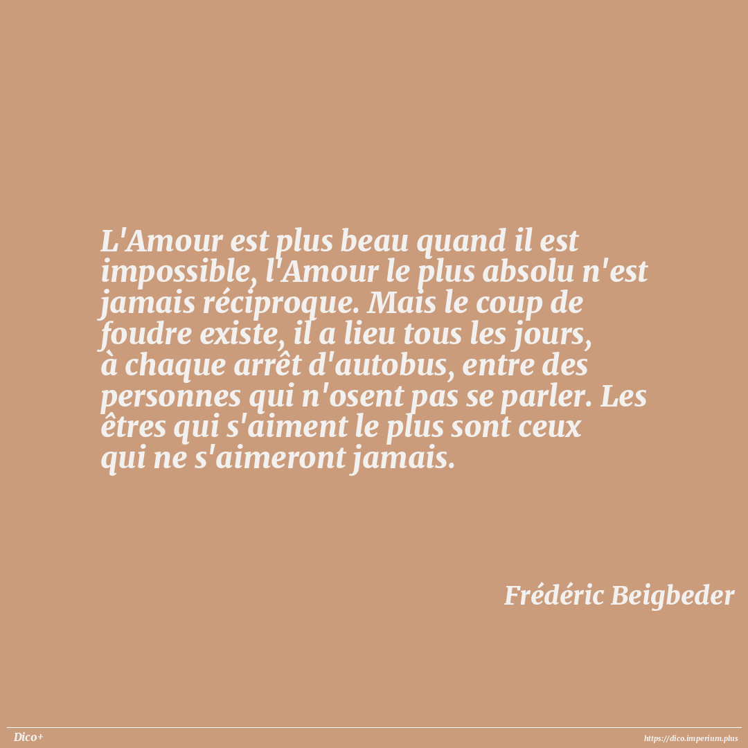 L'Amour est plus beau quand il est impossible, l'Amour le plus absolu n'est jamais réciproque. Mais le coup de foudre existe, il a lieu tous les jours, à chaque arrêt d'autobus, entre des personnes qui n'osent pas se parler. Les êtres qui s'aiment le plus sont ceux qui ne s'aimeront jamais.