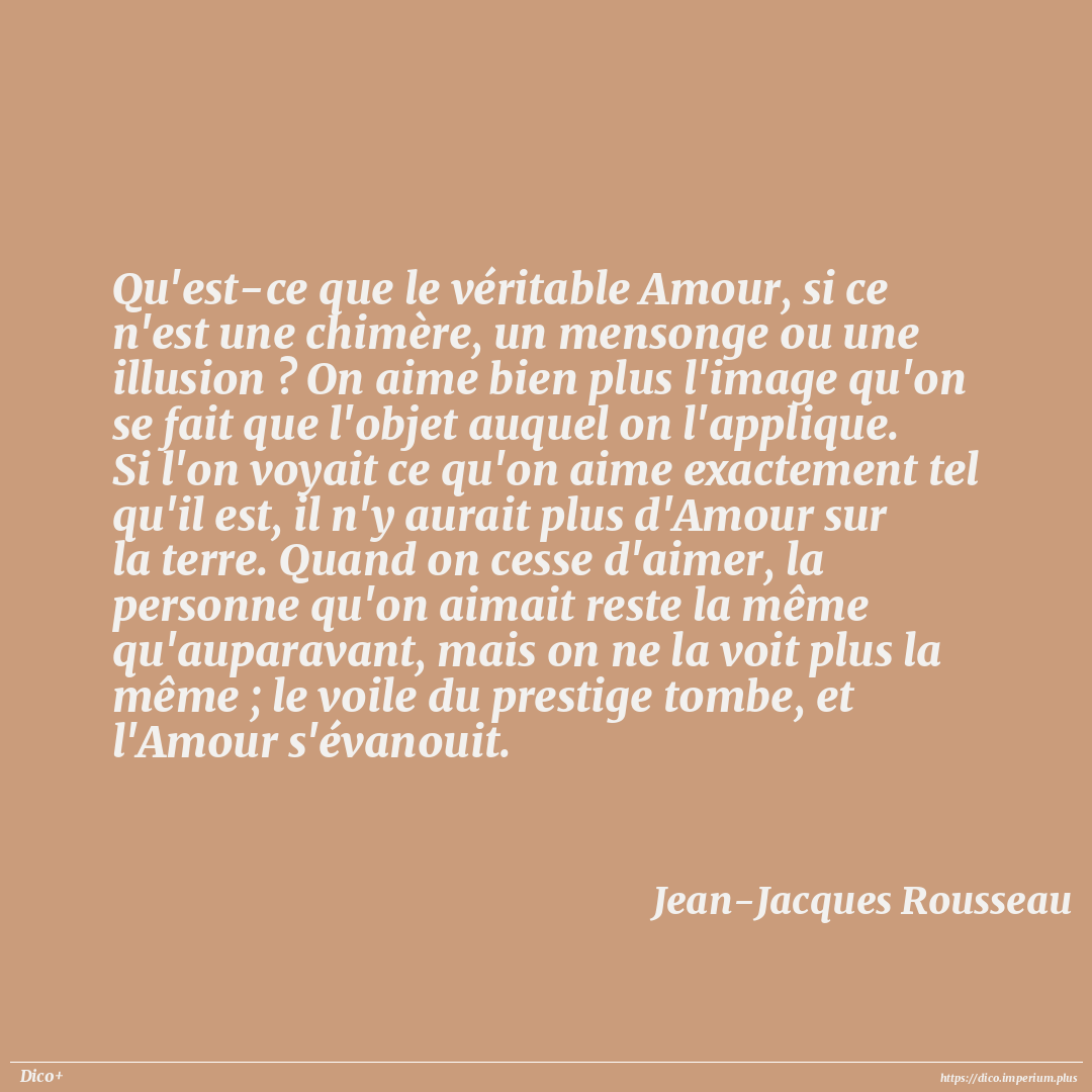 Qu'est-ce que le véritable Amour, si ce n'est une chimère, un mensonge ou une illusion ? On aime bien plus l'image qu'on se fait que l'objet auquel on l'applique. Si l'on voyait ce qu'on aime exactement tel qu'il est, il n'y aurait plus d'Amour sur la terre. Quand on cesse d'aimer, la personne qu'on aimait reste la même qu'auparavant, mais on ne la voit plus la même ; le voile du prestige tombe, et l'Amour s'évanouit.
