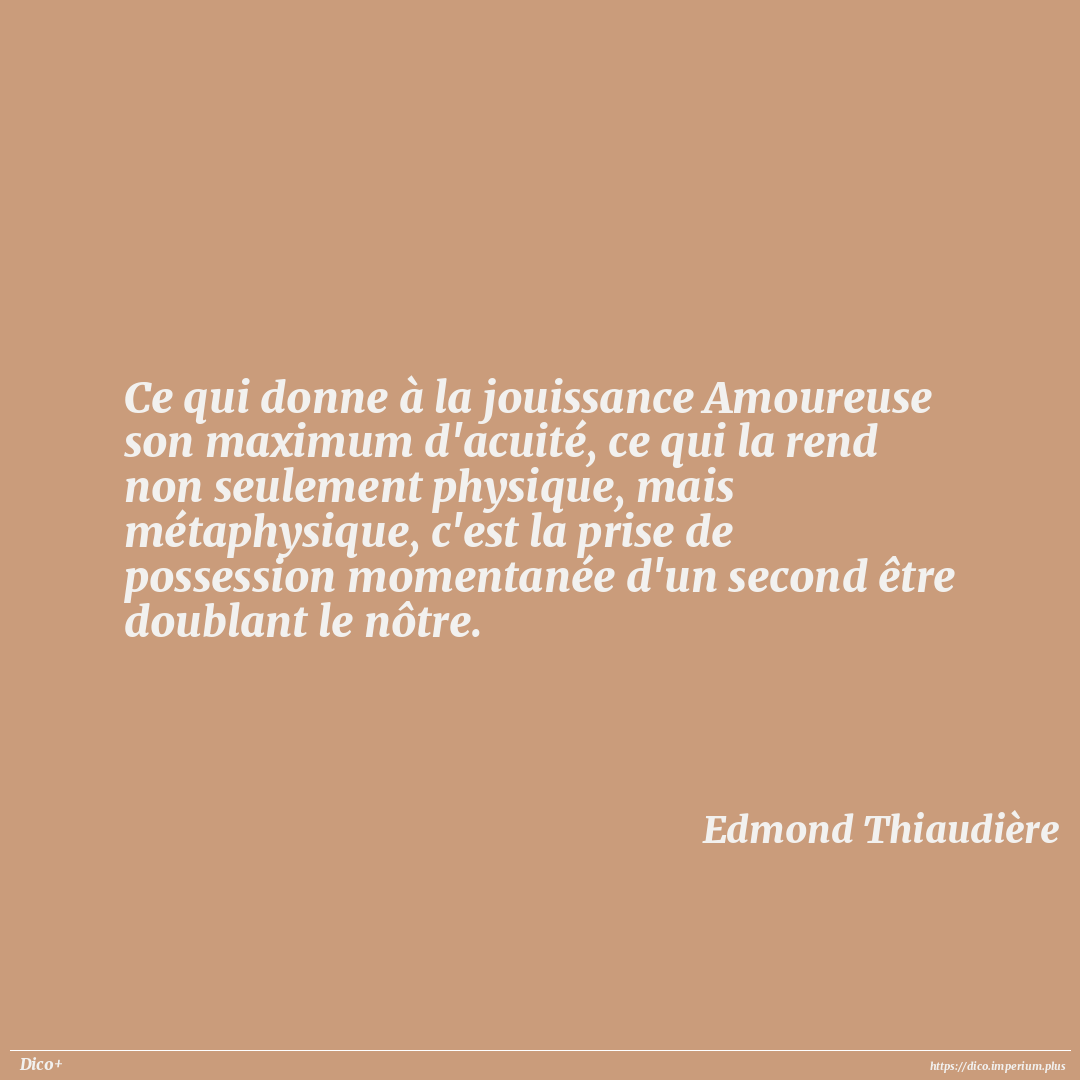 Ce qui donne à la jouissance Amoureuse son maximum d'acuité, ce qui la rend non seulement physique, mais métaphysique, c'est la prise de possession momentanée d'un second être doublant le nôtre.