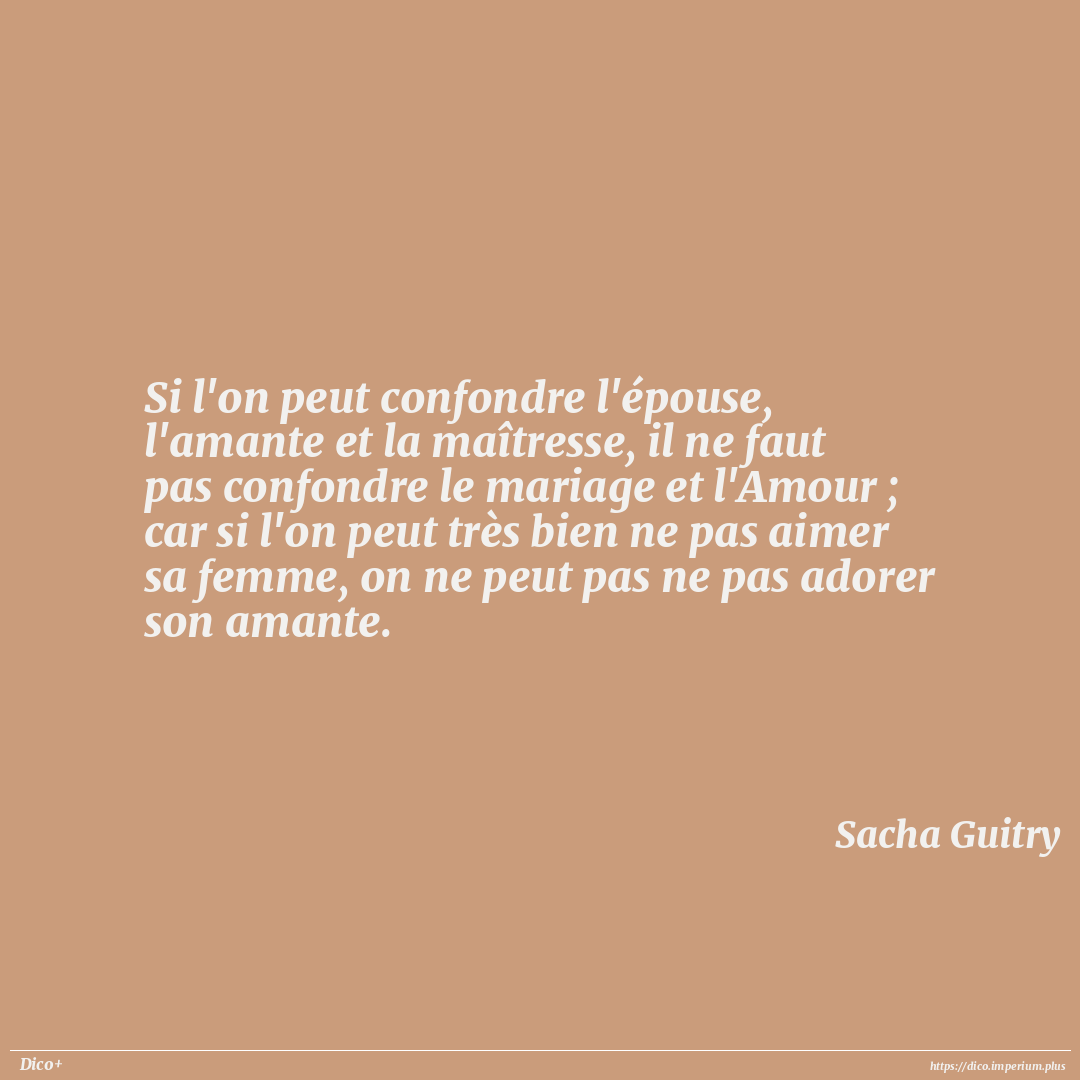 Si l'on peut confondre l'épouse, l'amante et la maîtresse, il ne faut pas confondre le mariage et l'Amour ; car si l'on peut très bien ne pas aimer sa femme, on ne peut pas ne pas adorer son amante.
