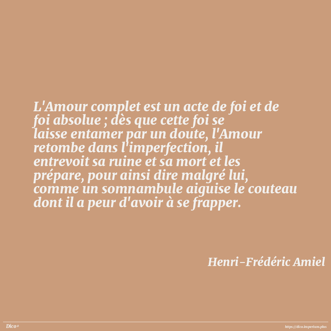 L'Amour complet est un acte de foi et de foi absolue ; dès que cette foi se laisse entamer par un doute, l'Amour retombe dans l'imperfection, il entrevoit sa ruine et sa mort et les prépare, pour ainsi dire malgré lui, comme un somnambule aiguise le couteau dont il a peur d'avoir à se frapper.