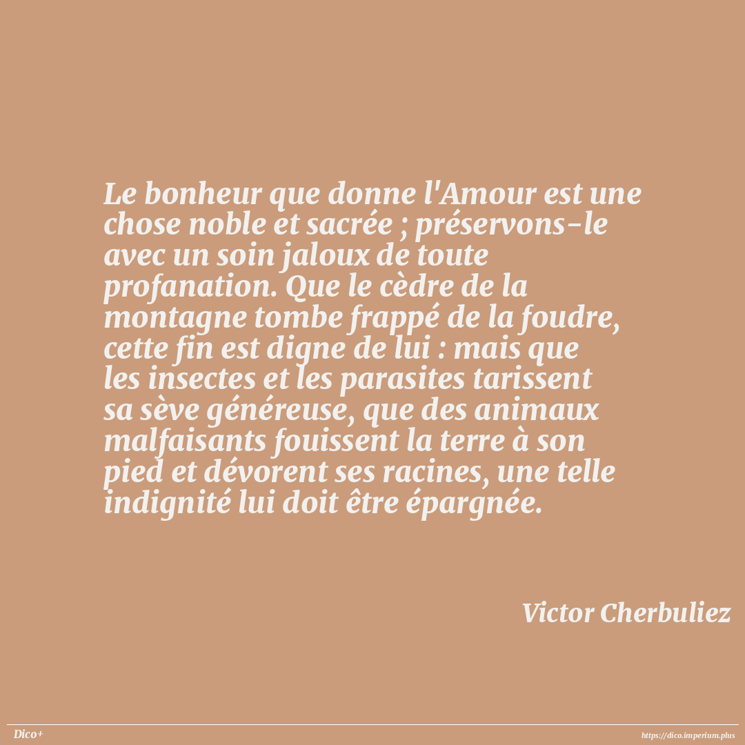 Le bonheur que donne l'Amour est une chose noble et sacrée ; préservons-le avec un soin jaloux de toute profanation. Que le cèdre de la montagne tombe frappé de la foudre, cette fin est digne de lui : mais que les insectes et les parasites tarissent sa sève généreuse, que des animaux malfaisants fouissent la terre à son pied et dévorent ses racines, une telle indignité lui doit être épargnée.