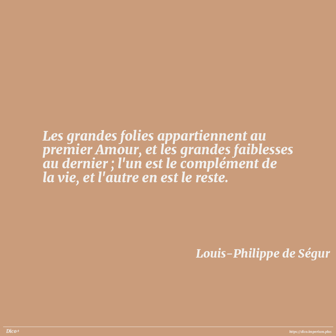 Les grandes folies appartiennent au premier Amour, et les grandes faiblesses au dernier ; l'un est le complément de la vie, et l'autre en est le reste.