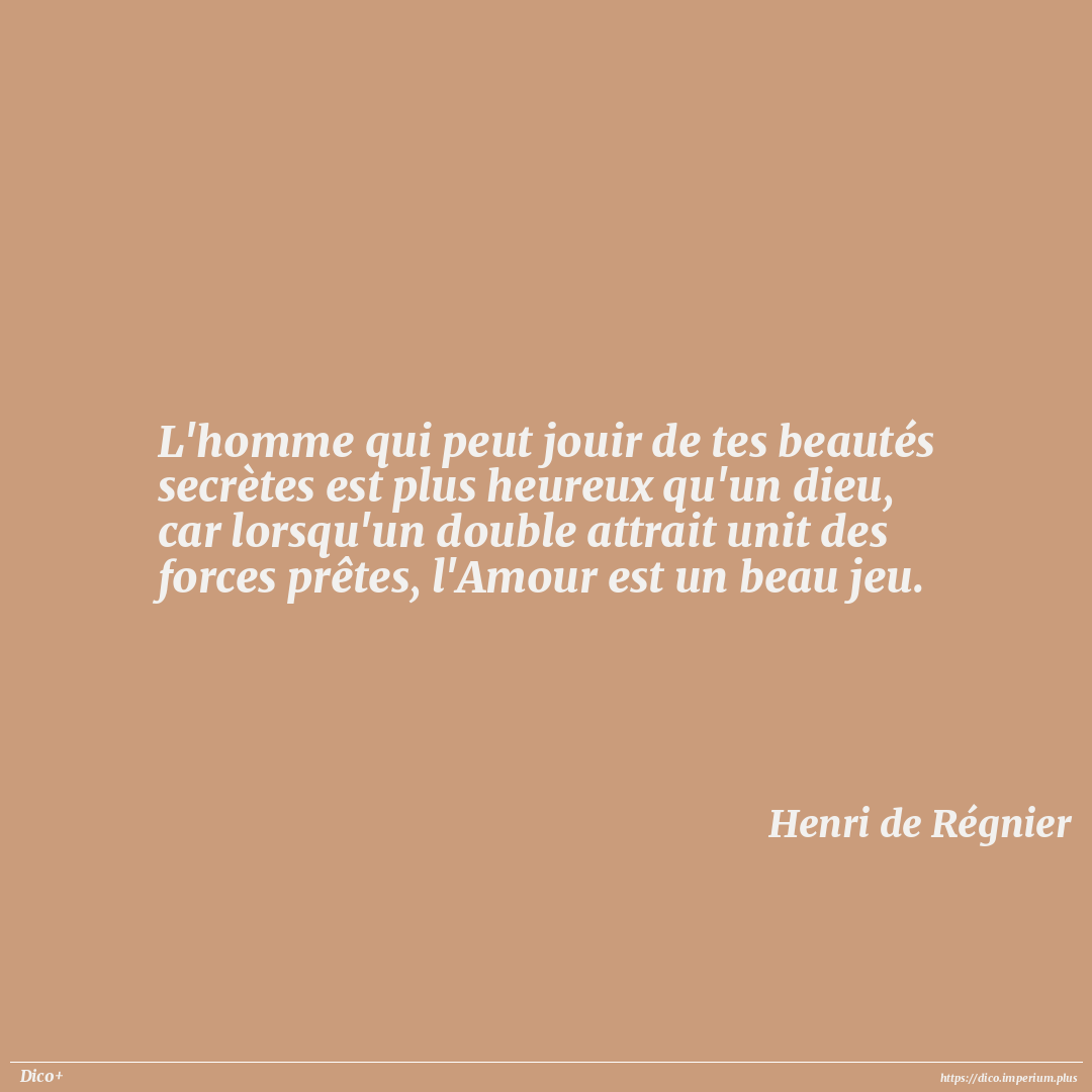 L'homme qui peut jouir de tes beautés secrètes est plus heureux qu'un dieu, car lorsqu'un double attrait unit des forces prêtes, l'Amour est un beau jeu.