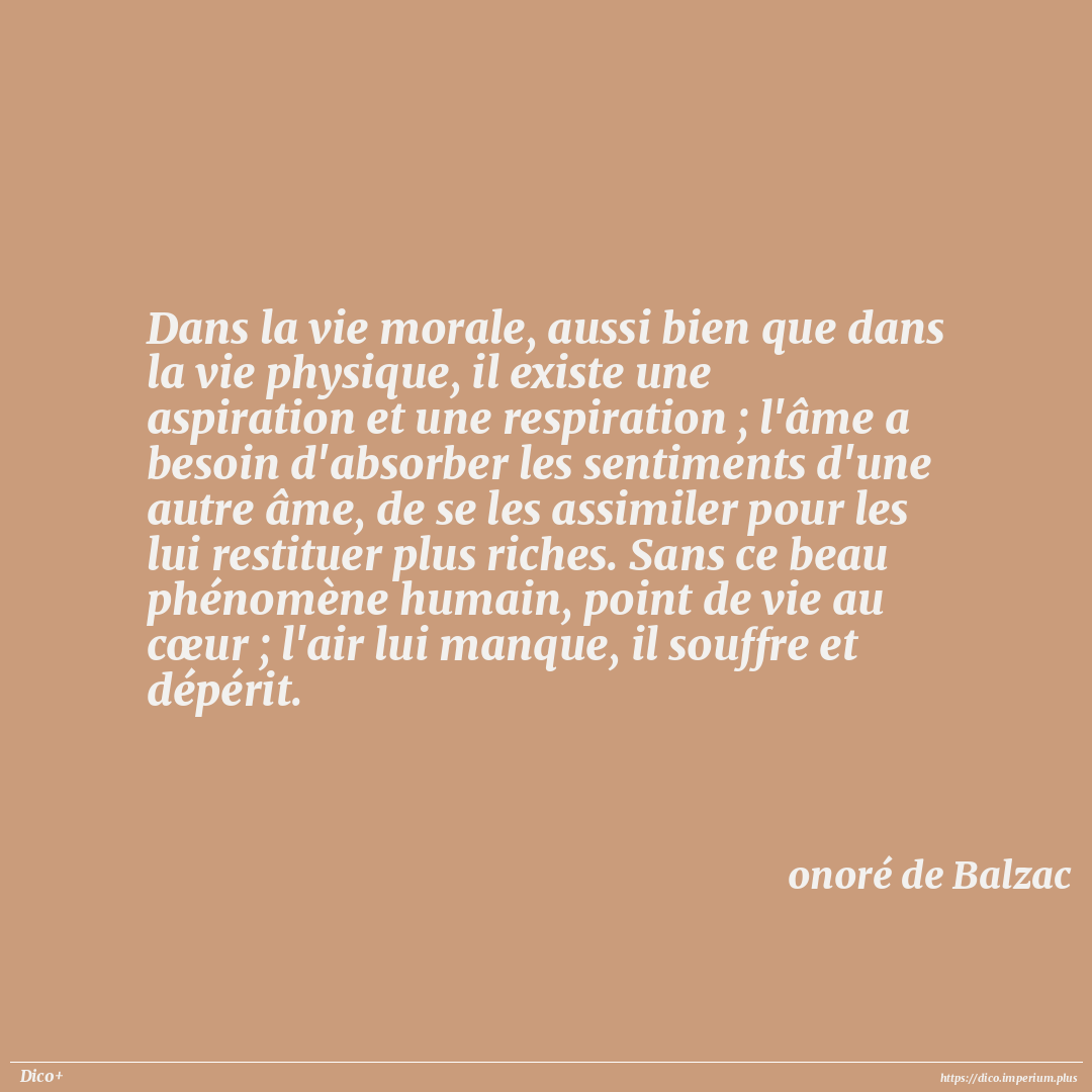 Dans la vie morale, aussi bien que dans la vie physique, il existe une aspiration et une respiration ; l'âme a besoin d'absorber les sentiments d'une autre âme, de se les assimiler pour les lui restituer plus riches. Sans ce beau phénomène humain, point de vie au cœur ; l'air lui manque, il souffre et dépérit.