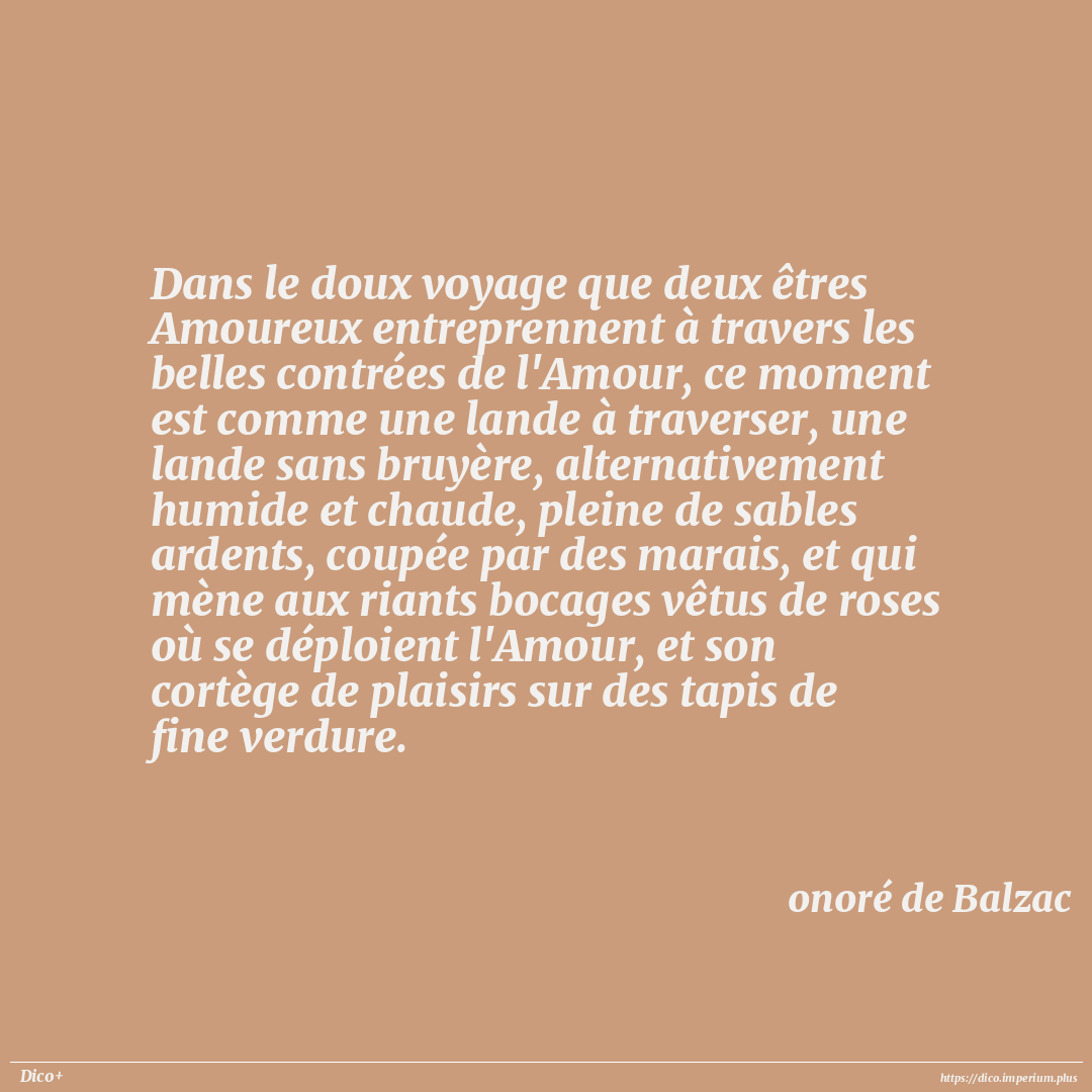 Dans le doux voyage que deux êtres Amoureux entreprennent à travers les belles contrées de l'Amour, ce moment est comme une lande à traverser, une lande sans bruyère, alternativement humide et chaude, pleine de sables ardents, coupée par des marais, et qui mène aux riants bocages vêtus de roses où se déploient l'Amour, et son cortège de plaisirs sur des tapis de fine verdure.