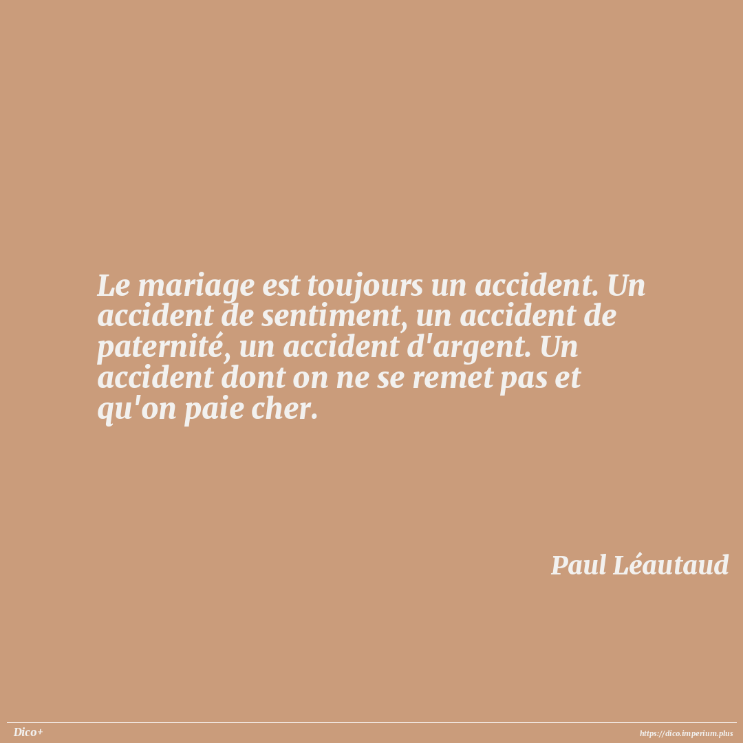 Le mariage est toujours un accident. Un accident de sentiment, un accident de paternité, un accident d'argent. Un accident dont on ne se remet pas et qu'on paie cher.