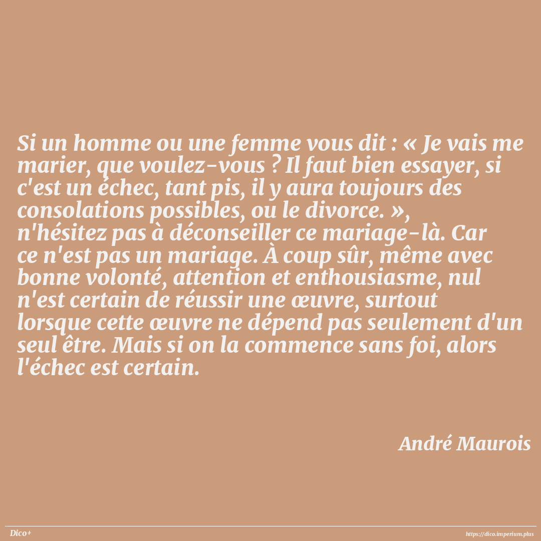 Si un homme ou une femme vous dit : « Je vais me marier, que voulez-vous ? Il faut bien essayer, si c'est un échec, tant pis, il y aura toujours des consolations possibles, ou le divorce. », n'hésitez pas à déconseiller ce mariage-là. Car ce n'est pas un mariage. À coup sûr, même avec bonne volonté, attention et enthousiasme, nul n'est certain de réussir une œuvre, surtout lorsque cette œuvre ne dépend pas seulement d'un seul être. Mais si on la commence sans foi, alors l'échec est certain.
