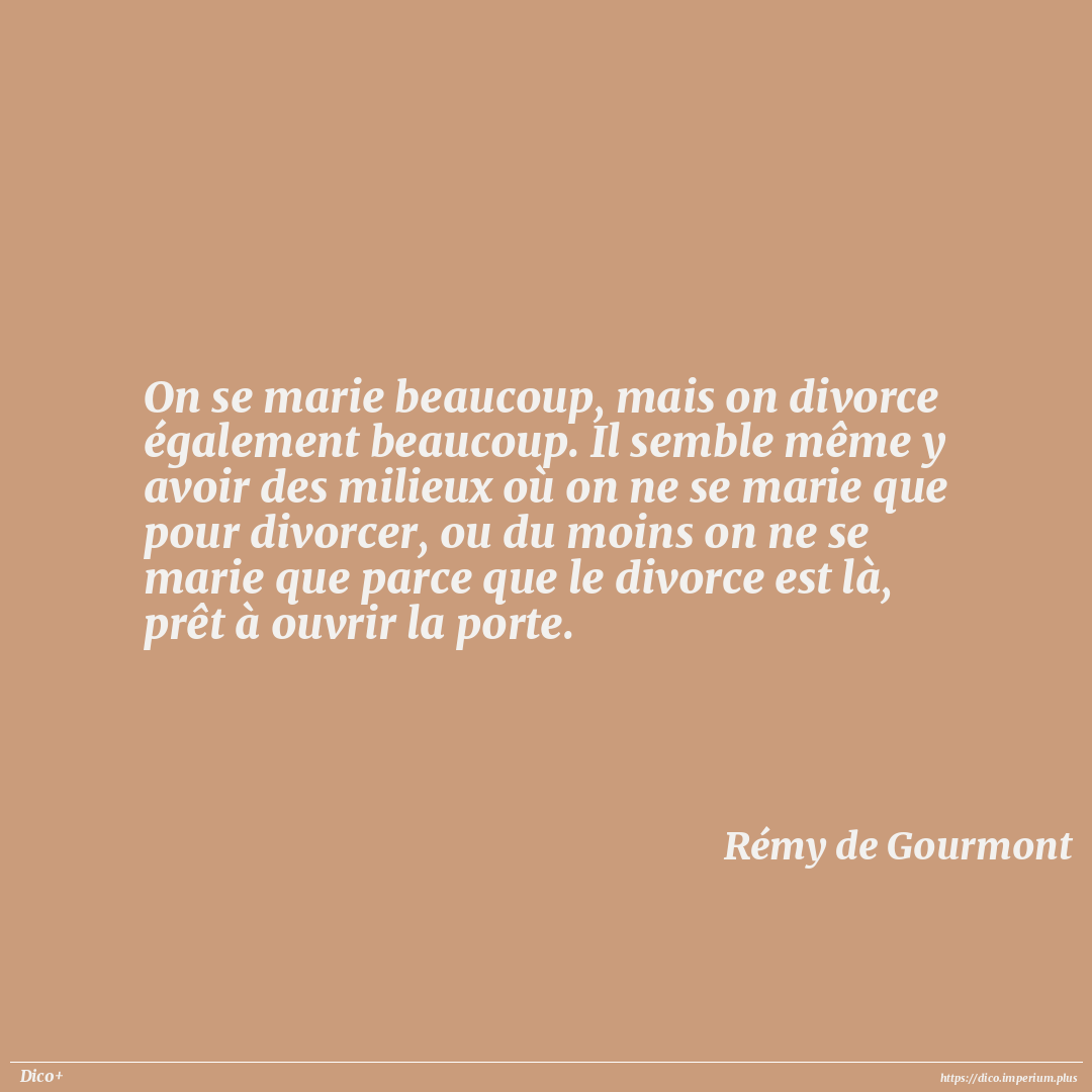 On se marie beaucoup, mais on divorce également beaucoup. Il semble même y avoir des milieux où on ne se marie que pour divorcer, ou du moins on ne se marie que parce que le divorce est là, prêt à ouvrir la porte.