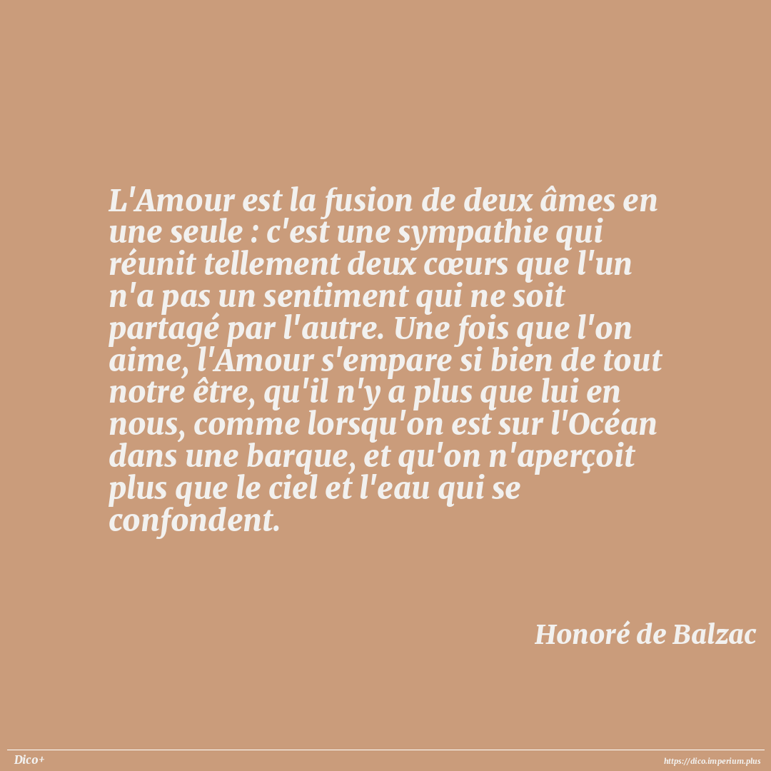 L'Amour est la fusion de deux âmes en une seule : c'est une sympathie qui réunit tellement deux cœurs que l'un n'a pas un sentiment qui ne soit partagé par l'autre. Une fois que l'on aime, l'Amour s'empare si bien de tout notre être, qu'il n'y a plus que lui en nous, comme lorsqu'on est sur l'Océan dans une barque, et qu'on n'aperçoit plus que le ciel et l'eau qui se confondent.