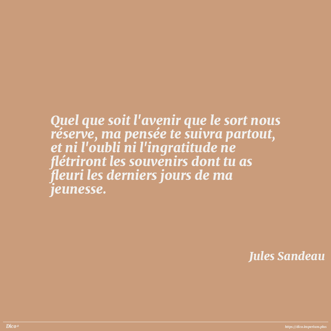 Quel que soit l'avenir que le sort nous réserve, ma pensée te suivra partout, et ni l'oubli ni l'ingratitude ne flétriront les souvenirs dont tu as fleuri les derniers jours de ma jeunesse.