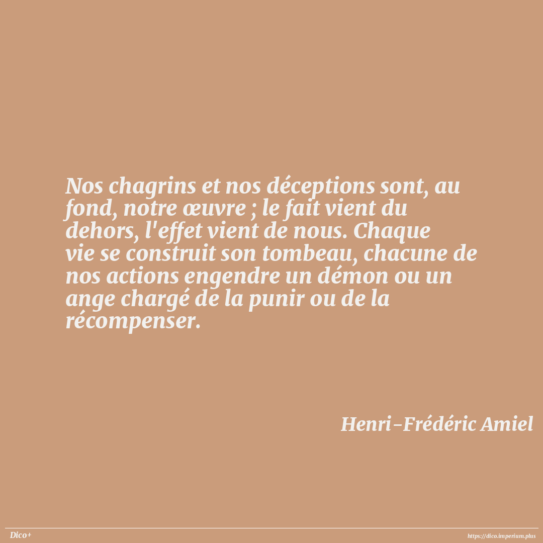 Nos chagrins et nos déceptions sont, au fond, notre œuvre ; le fait vient du dehors, l'effet vient de nous. Chaque vie se construit son tombeau, chacune de nos actions engendre un démon ou un ange chargé de la punir ou de la récompenser.