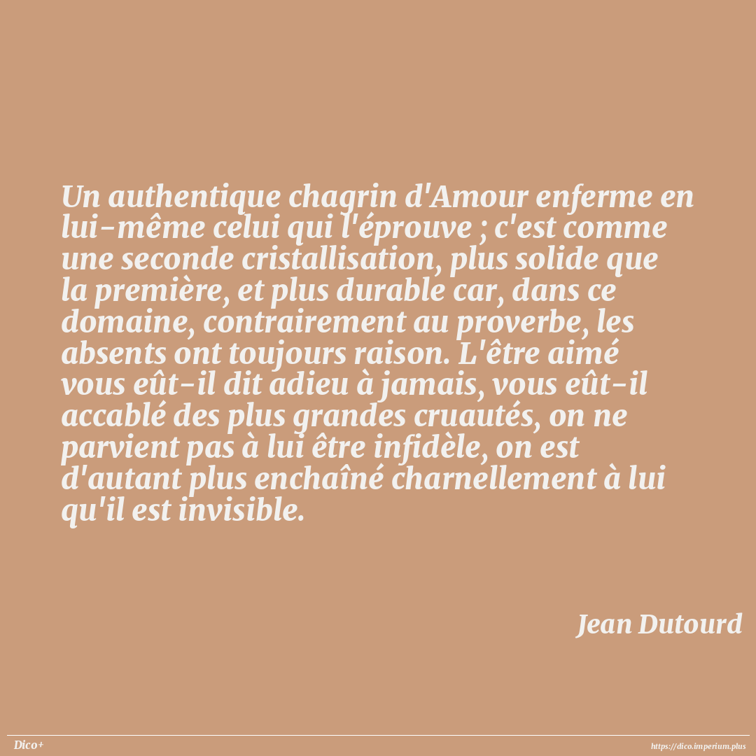 Un authentique chagrin d'Amour enferme en lui-même celui qui l'éprouve ; c'est comme une seconde cristallisation, plus solide que la première, et plus durable car, dans ce domaine, contrairement au proverbe, les absents ont toujours raison. L'être aimé vous eût-il dit adieu à jamais, vous eût-il accablé des plus grandes cruautés, on ne parvient pas à lui être infidèle, on est d'autant plus enchaîné charnellement à lui qu'il est invisible.