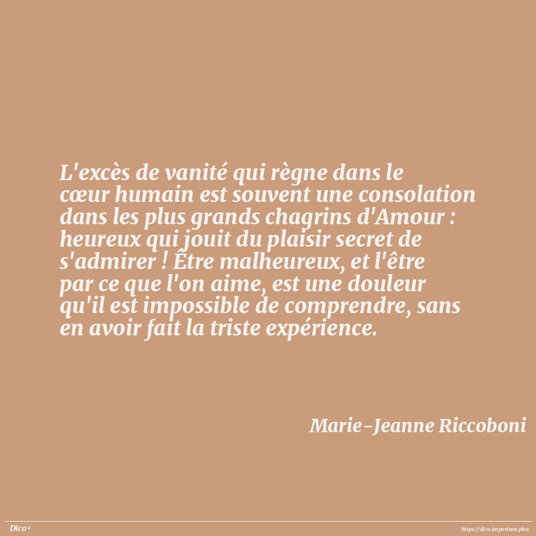 L'excès de vanité qui règne dans le cœur humain est souvent une consolation dans les plus grands chagrins d'Amour : heureux qui jouit du plaisir secret de s'admirer ! Être malheureux, et l'être par ce que l'on aime, est une douleur qu'il est impossible de comprendre, sans en avoir fait la triste expérience.