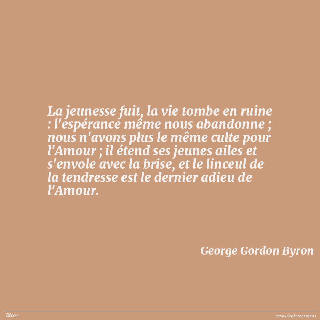 La jeunesse fuit, la vie tombe en ruine : l'espérance même nous abandonne ; nous n'avons plus le même culte pour l'Amour ; il étend ses jeunes ailes et s'envole avec la brise, et le linceul de la tendresse est le dernier adieu de l'Amour.