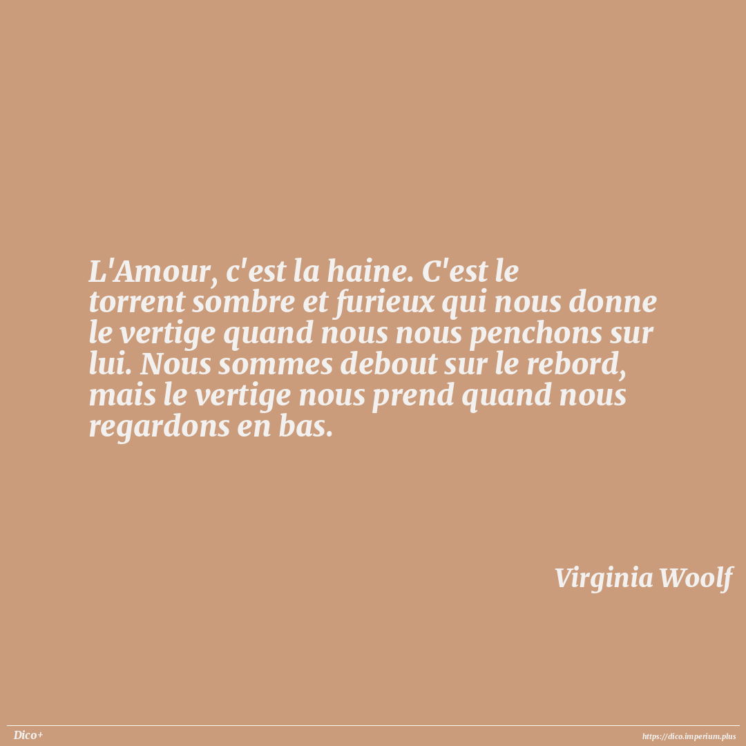 L'Amour, c'est la haine. C'est le torrent sombre et furieux qui nous donne le vertige quand nous nous penchons sur lui. Nous sommes debout sur le rebord, mais le vertige nous prend quand nous regardons en bas.