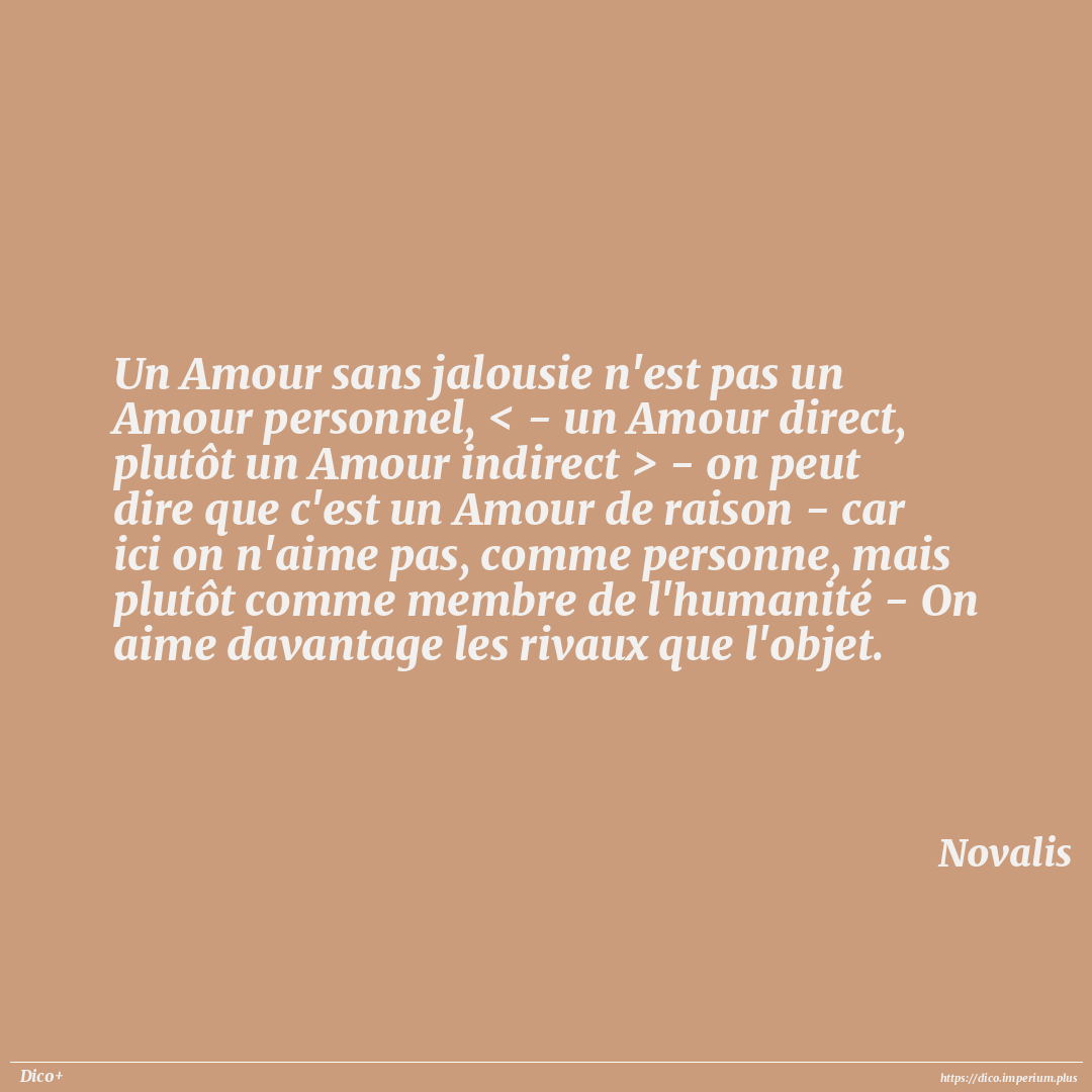 Un Amour sans jalousie n'est pas un Amour personnel, < - un Amour direct, plutôt un Amour indirect > - on peut dire que c'est un Amour de raison - car ici on n'aime pas, comme personne, mais plutôt comme membre de l'humanité - On aime davantage les rivaux que l'objet.