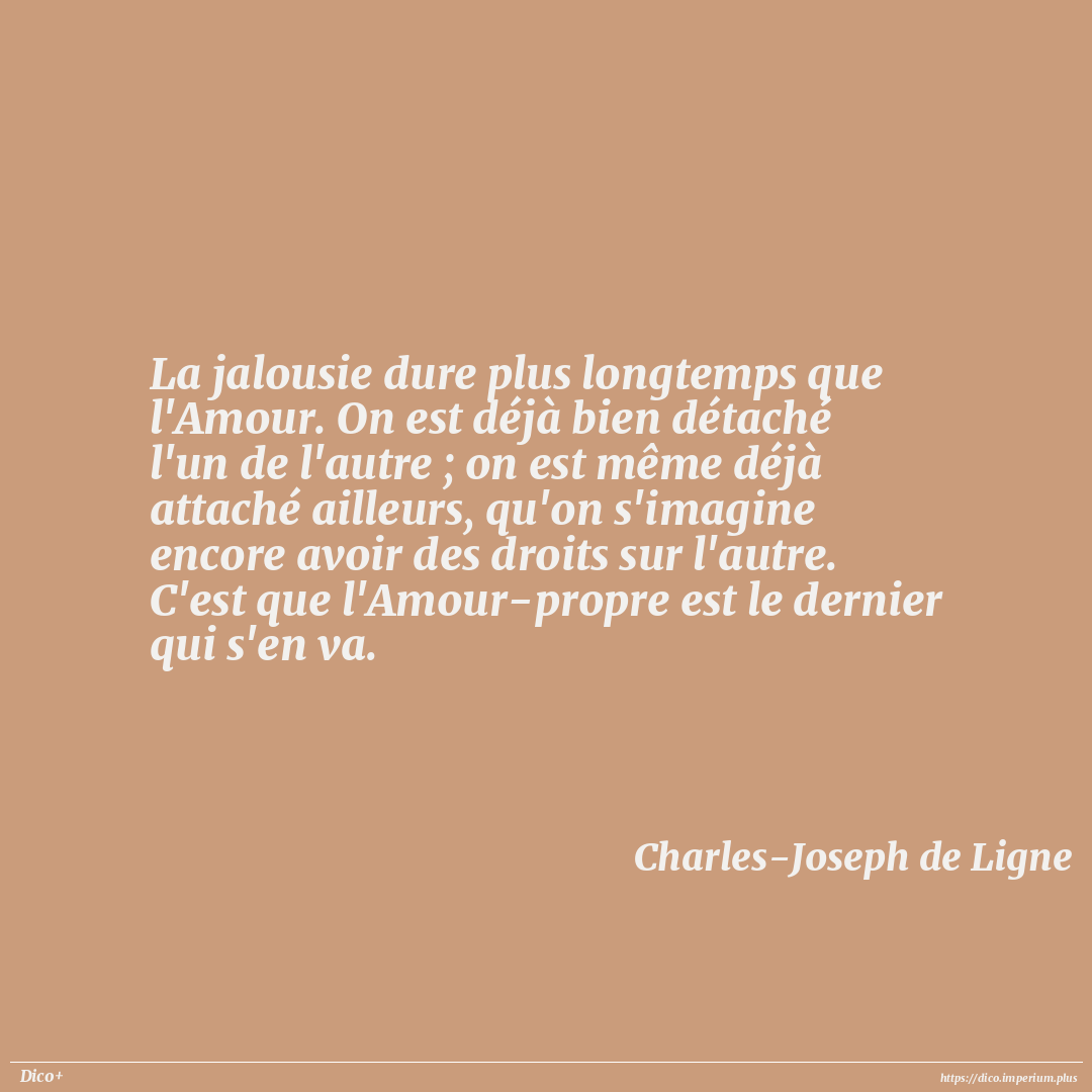 La jalousie dure plus longtemps que l'Amour. On est déjà bien détaché l'un de l'autre ; on est même déjà attaché ailleurs, qu'on s'imagine encore avoir des droits sur l'autre. C'est que l'Amour-propre est le dernier qui s'en va.