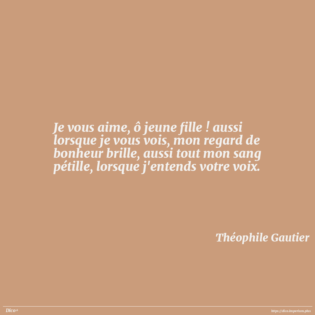 Je vous aime, ô jeune fille ! aussi lorsque je vous vois, mon regard de bonheur brille, aussi tout mon sang pétille, lorsque j'entends votre voix.