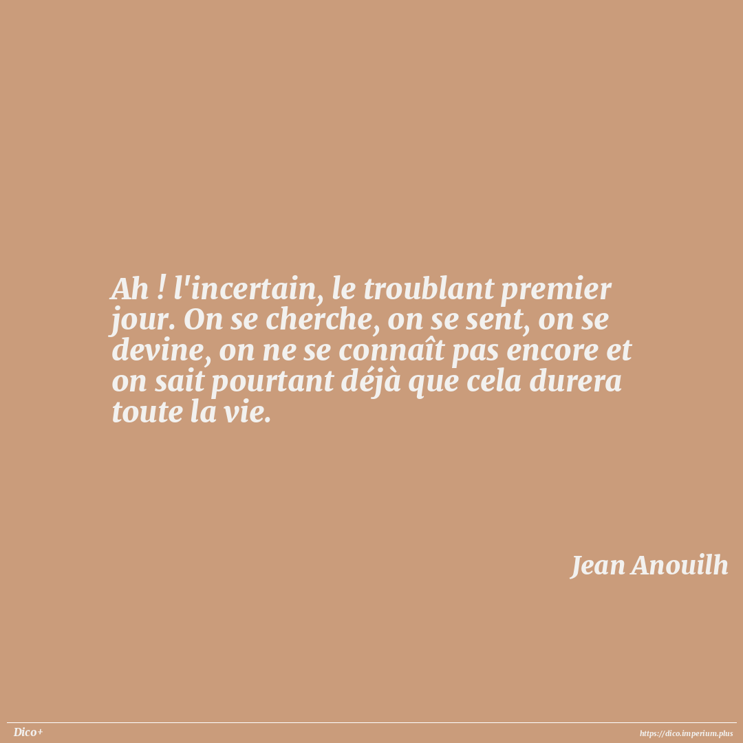 Ah ! l'incertain, le troublant premier jour. On se cherche, on se sent, on se devine, on ne se connaît pas encore et on sait pourtant déjà que cela durera toute la vie.