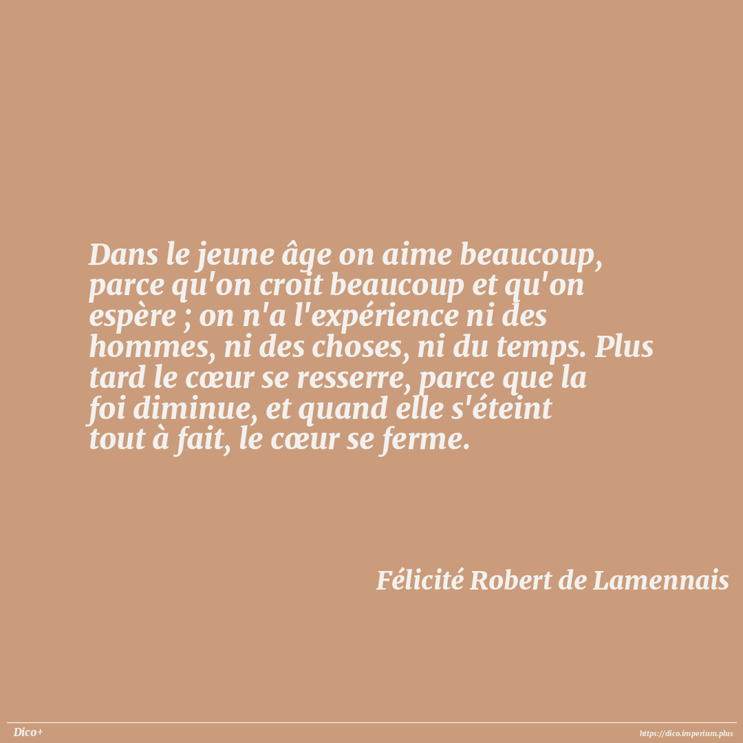 Dans le jeune âge on aime beaucoup, parce qu'on croit beaucoup et qu'on espère ; on n'a l'expérience ni des hommes, ni des choses, ni du temps. Plus tard le cœur se resserre, parce que la foi diminue, et quand elle s'éteint tout à fait, le cœur se ferme.
