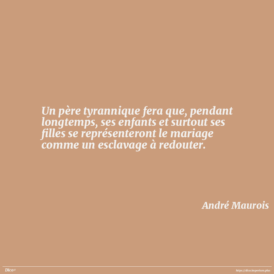 Un père tyrannique fera que, pendant longtemps, ses enfants et surtout ses filles se représenteront le mariage comme un esclavage à redouter.