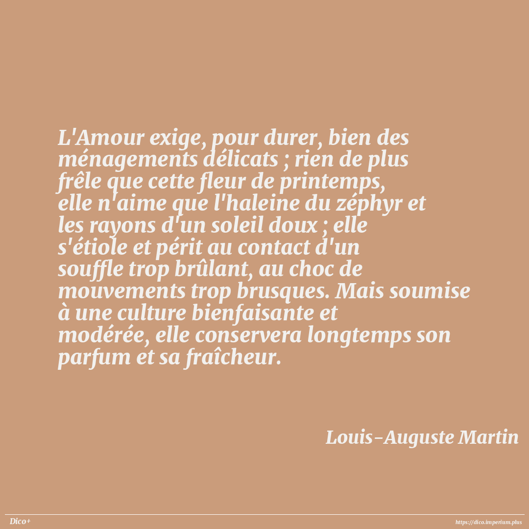 L'Amour exige, pour durer, bien des ménagements délicats ; rien de plus frêle que cette fleur de printemps, elle n'aime que l'haleine du zéphyr et les rayons d'un soleil doux ; elle s'étiole et périt au contact d'un souffle trop brûlant, au choc de mouvements trop brusques. Mais soumise à une culture bienfaisante et modérée, elle conservera longtemps son parfum et sa fraîcheur.