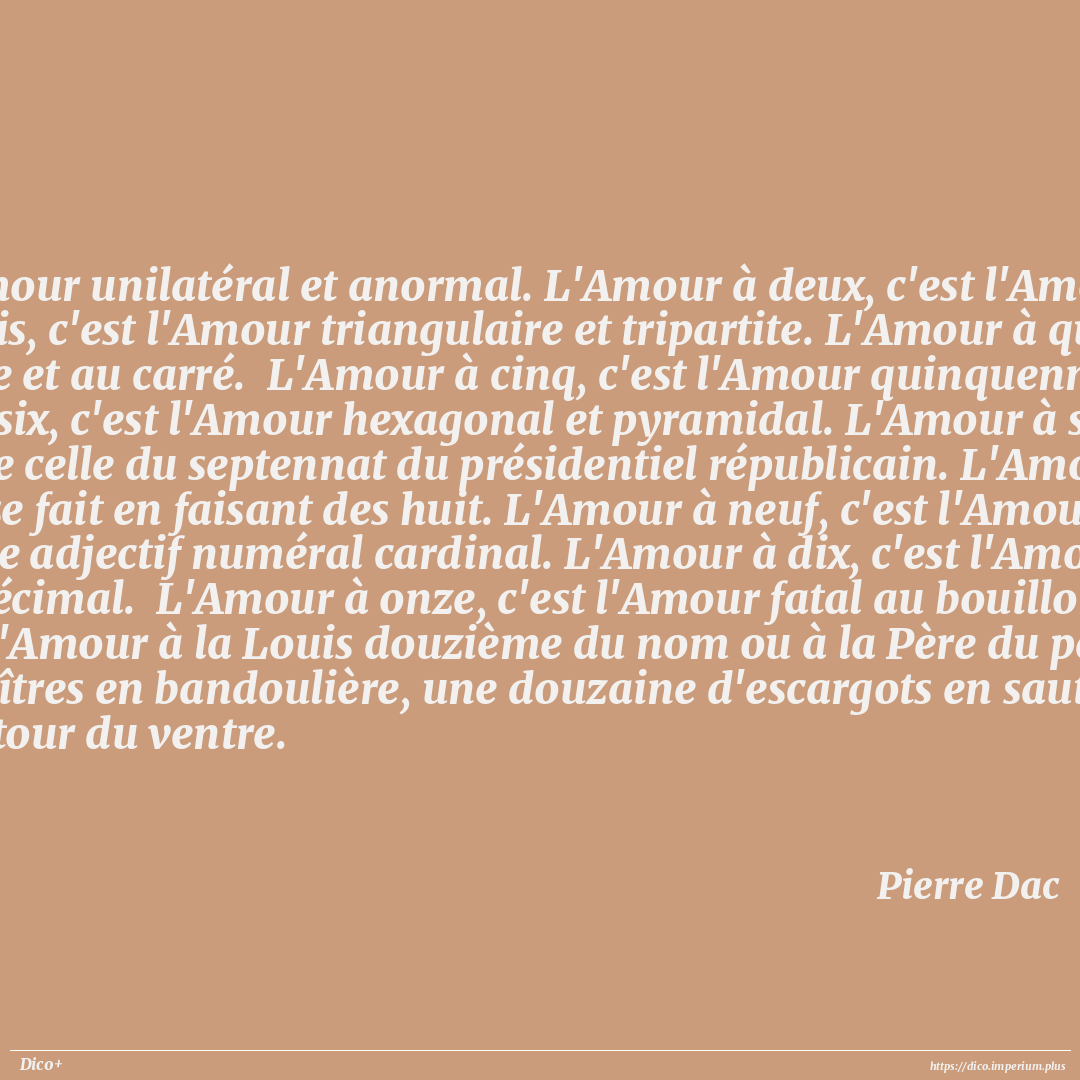 L'Amour à un, c'est l'Amour unilatéral et anormal. L'Amour à deux, c'est l'Amour normal et bilatéral. L'Amour à trois, c'est l'Amour triangulaire et tripartite. L'Amour à quatre, c'est l'Amour quadrangulaire et au carré. L'Amour à cinq, c'est l'Amour quinquennal conforme au plan du même nom. L'Amour à six, c'est l'Amour hexagonal et pyramidal. L'Amour à sept, c'est l'Amour septennal en fonction de celle du septennat du présidentiel républicain. L'Amour à huit, c'est l'Amour octogonal qui se fait en faisant des huit. L'Amour à neuf, c'est l'Amour qui se pratique sur ou sous le pont du même adjectif numéral cardinal. L'Amour à dix, c'est l'Amour systématique et décadaire du système décimal. L'Amour à onze, c'est l'Amour fatal au bouillon de la même heure. L'Amour à douze, c'est l'Amour à la Louis douzième du nom ou à la Père du peuple, qui s'exerce avec une douzaine d'huîtres en bandoulière, une douzaine d'escargots en sautoir et une grosse de moules en couronne autour du ventre.