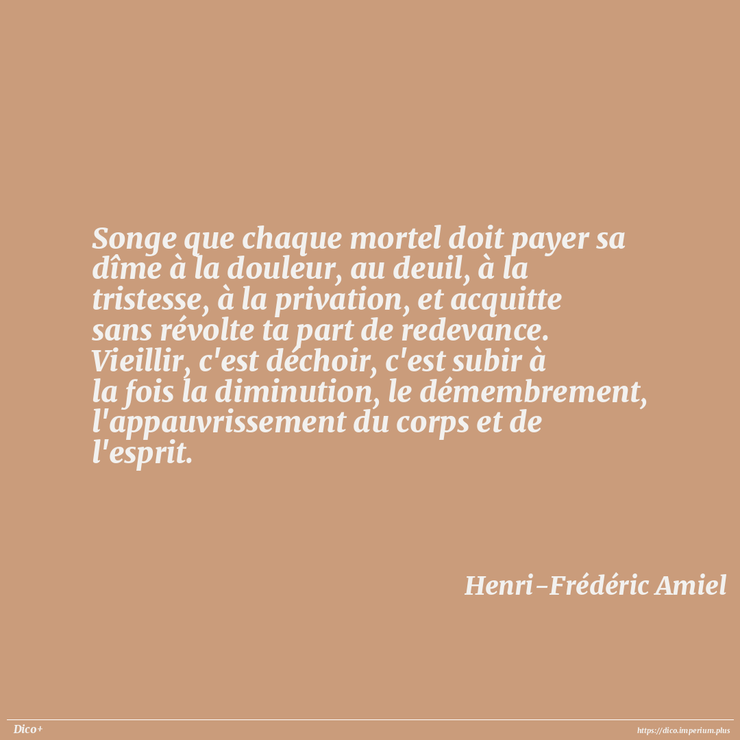 Songe que chaque mortel doit payer sa dîme à la douleur, au deuil, à la tristesse, à la privation, et acquitte sans révolte ta part de redevance. Vieillir, c'est déchoir, c'est subir à la fois la diminution, le démembrement, l'appauvrissement du corps et de l'esprit.