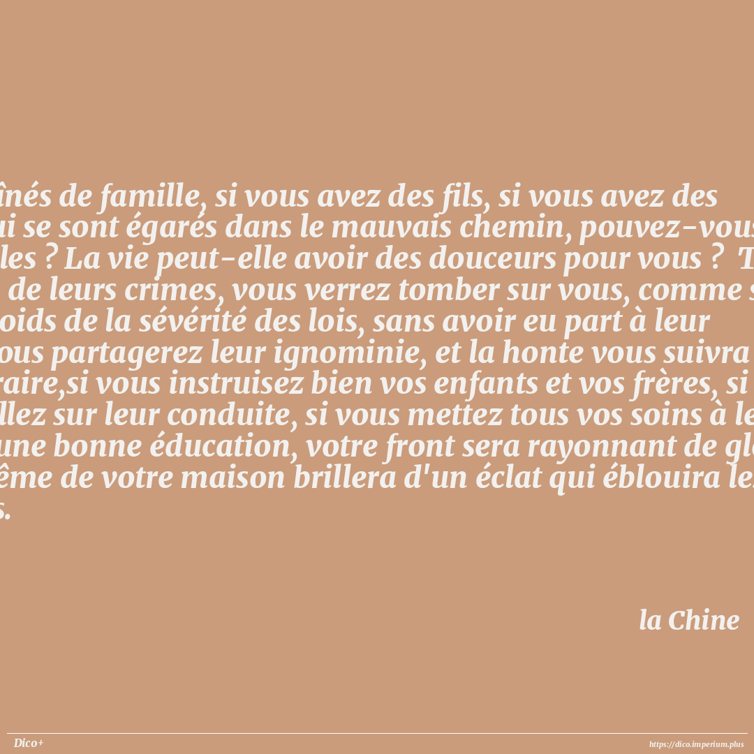 Pères, Aînés de famille, si vous avez des fils, si vous avez des frères qui se sont égarés dans le mauvais chemin, pouvez-vous être tranquilles ? La vie peut-elle avoir des douceurs pour vous ? Tristes victimes de leurs crimes, vous verrez tomber sur vous, comme sur eux, tout le poids de la sévérité des lois, sans avoir eu part à leur crime, vous partagerez leur ignominie, et la honte vous suivra partout. Au contraire,si vous instruisez bien vos enfants et vos frères, si vous veillez sur leur conduite, si vous mettez tous vos soins à leur donner une bonne éducation, votre front sera rayonnant de gloire, la porte même de votre maison brillera d'un éclat qui éblouira les passants.
