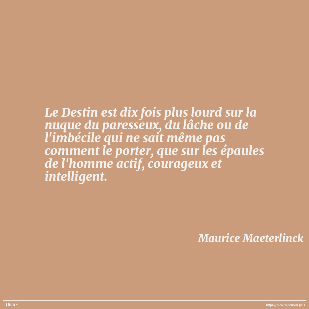 Le Destin est dix fois plus lourd sur la nuque du paresseux, du lâche ou de l'imbécile qui ne sait même pas comment le porter, que sur les épaules de l'homme actif, courageux et intelligent.