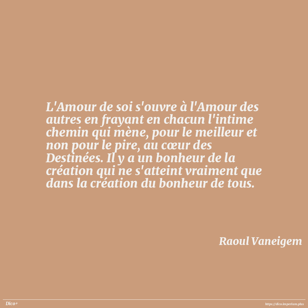 L'Amour de soi s'ouvre à l'Amour des autres en frayant en chacun l'intime chemin qui mène, pour le meilleur et non pour le pire, au cœur des Destinées. Il y a un bonheur de la création qui ne s'atteint vraiment que dans la création du bonheur de tous.