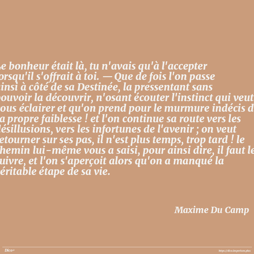 Le bonheur était là, tu n'avais qu'à l'accepter lorsqu'il s'offrait à toi. — Que de fois l'on passe ainsi à côté de sa Destinée, la pressentant sans pouvoir la découvrir, n'osant écouter l'instinct qui veut vous éclairer et qu'on prend pour le murmure indécis de sa propre faiblesse ! et l'on continue sa route vers les désillusions, vers les infortunes de l'avenir ; on veut retourner sur ses pas, il n'est plus temps, trop tard ! le chemin lui-même vous a saisi, pour ainsi dire, il faut le suivre, et l'on s'aperçoit alors qu'on a manqué la véritable étape de sa vie.
