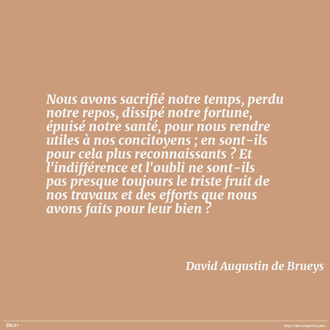 Nous avons sacrifié notre temps, perdu notre repos, dissipé notre fortune, épuisé notre santé, pour nous rendre utiles à nos concitoyens ; en sont-ils pour cela plus reconnaissants ? Et l'indifférence et l'oubli ne sont-ils pas presque toujours le triste fruit de nos travaux et des efforts que nous avons faits pour leur bien ?