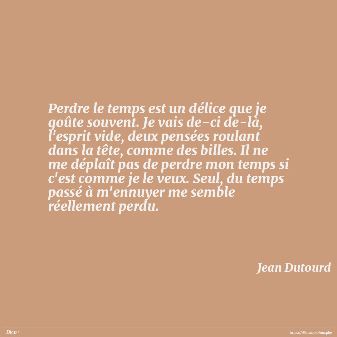 Perdre le temps est un délice que je goûte souvent. Je vais de-ci de-là, l'esprit vide, deux pensées roulant dans la tête, comme des billes. Il ne me déplaît pas de perdre mon temps si c'est comme je le veux. Seul, du temps passé à m'ennuyer me semble réellement perdu.