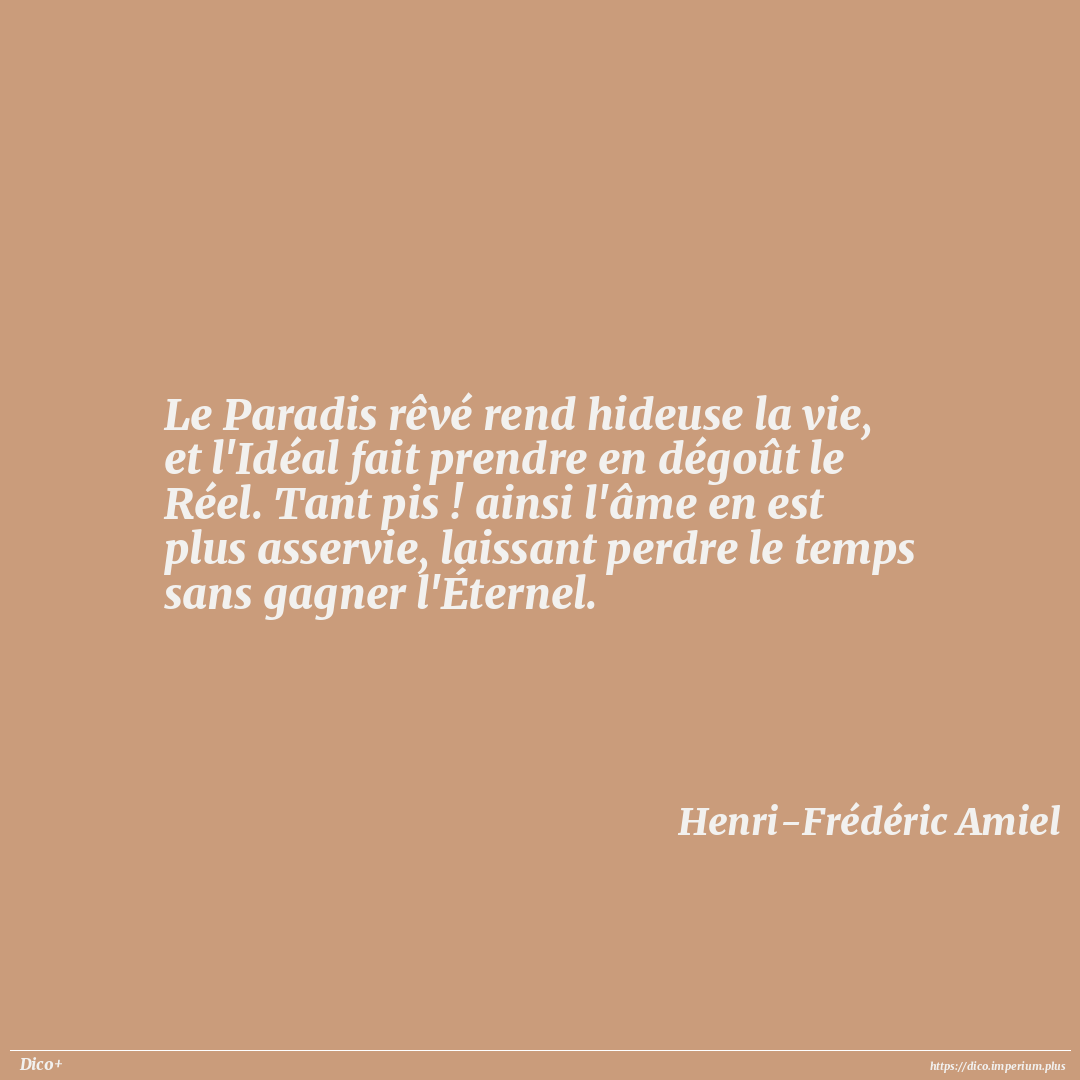 Le Paradis rêvé rend hideuse la vie, et l'Idéal fait prendre en dégoût le Réel. Tant pis ! ainsi l'âme en est plus asservie, laissant perdre le temps sans gagner l'Éternel.